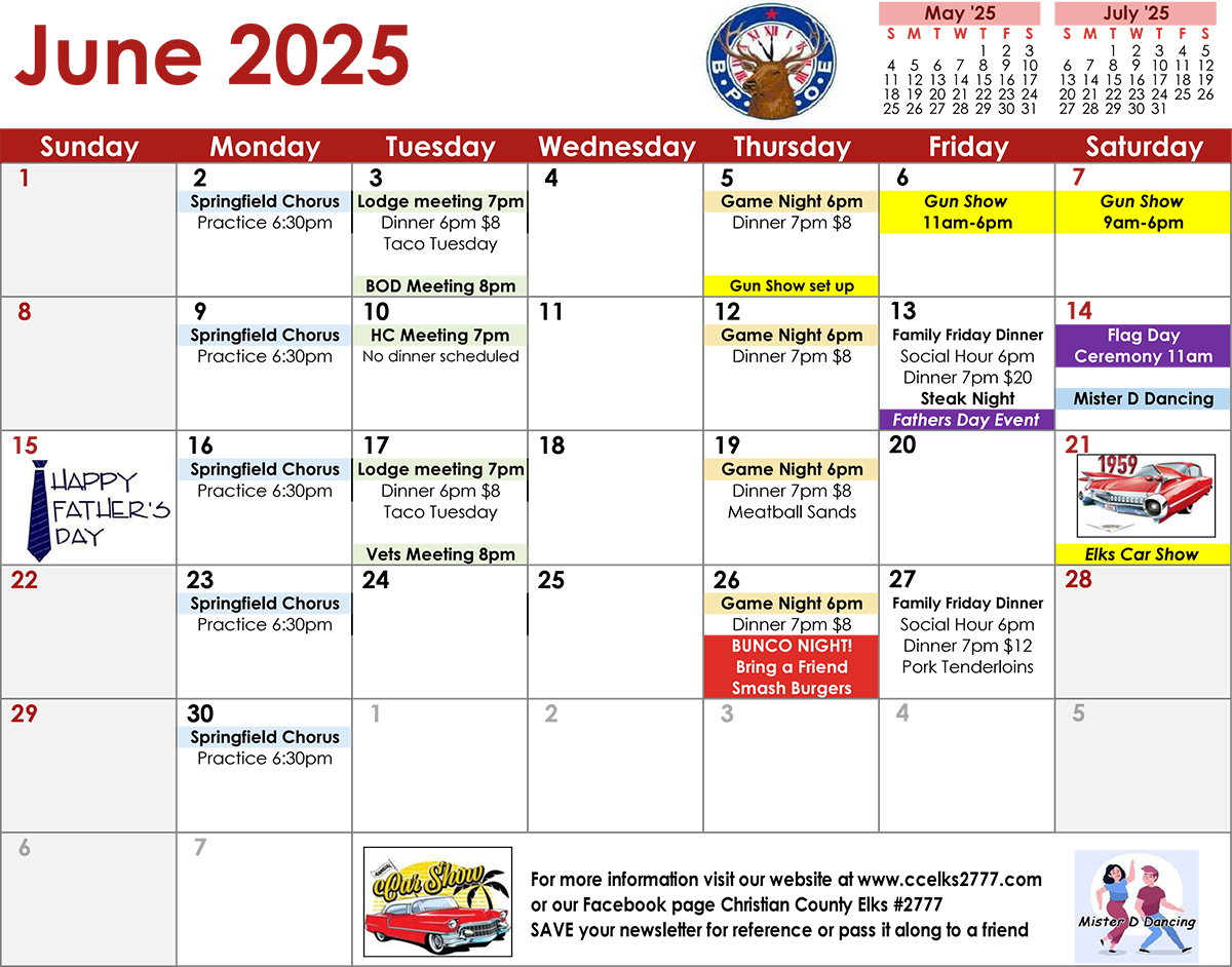 Christian County Elks 2777 Lodge Calendar is ready to review or print. Stay on top of all Lodge activities and other important dates you need to support our Lodge.